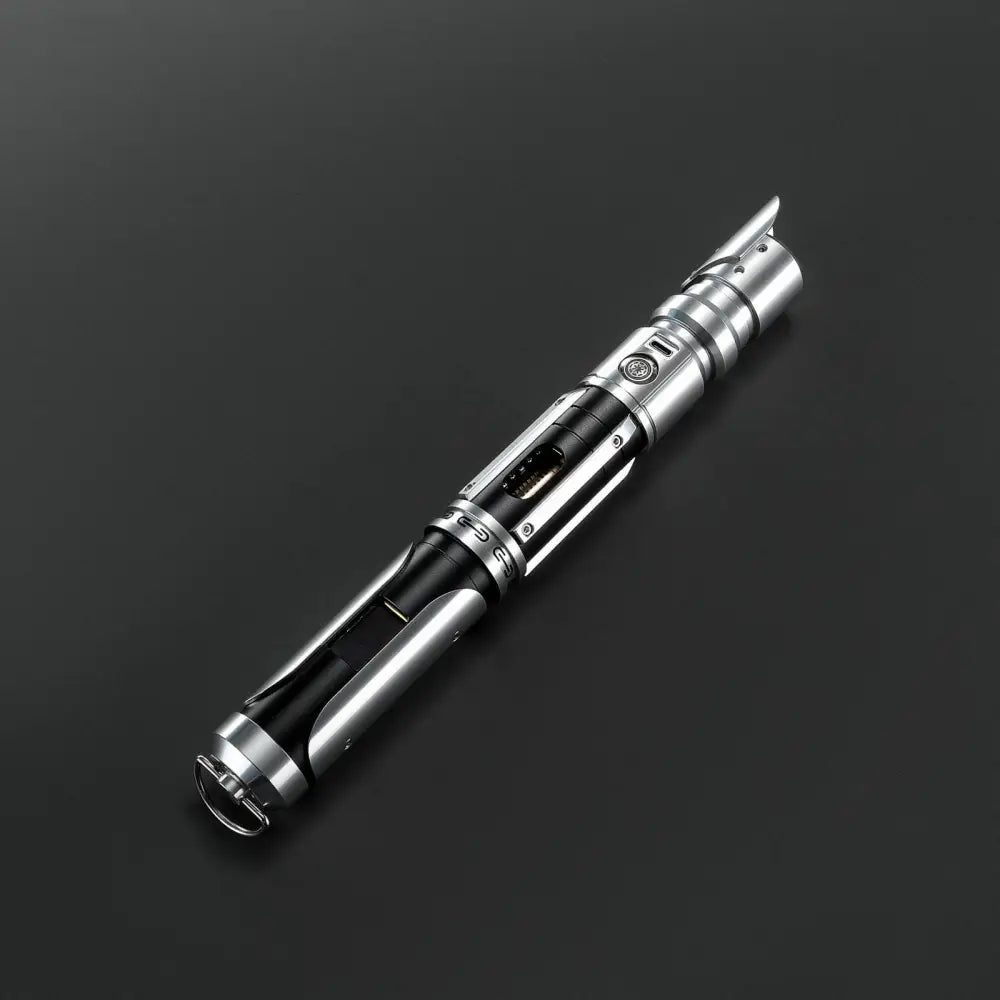 This lightsaber is designed to showcase the aesthetics and technology of its new extended core, featuring a detailed crystal chamber visible through the open-frame hilt. The integrated OLED screen adds a futuristic and functional touch, displaying dynamic and customizable information. The hilt design combines sleek metallic elements with black accents for a sophisticated and high-tech look, while the bright blade completes the iconic presence of this saber—perfect for collectors and choreographed dueling enthusiasts.