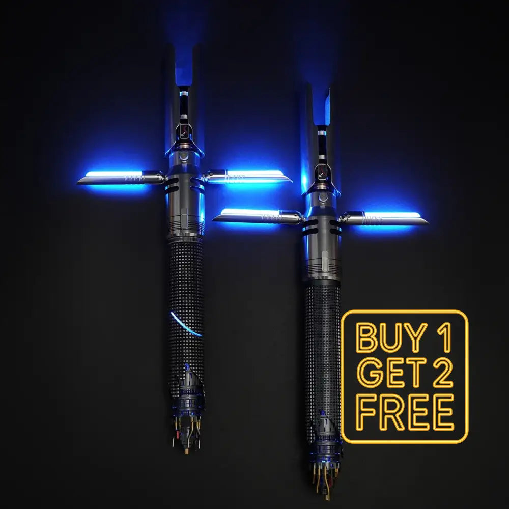 Crossguard 2.0 – A masterpiece inspired by the legendary Cal Kestis, this saber is a fusion of elegance and innovation. Its robust dark metal handle is enriched with intricate, visible technological details, delivering a design that feels both futuristic and grounded in craftsmanship. The combination of the commanding main blade and the striking twin side blades creates a visually stunning crossguard effect, perfect for those who seek a weapon as bold as their spirit.