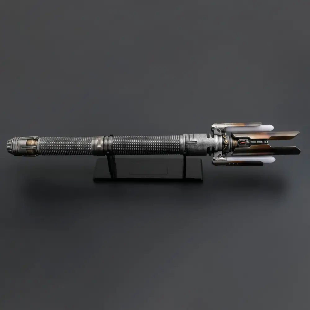 Discover the Cal Cross Guard Saber! This unique lightsaber features an innovative crossguard design with two fixed side blades, enhancing both protection and style. Please note that the side blades are securely attached with glue and cannot be removed.